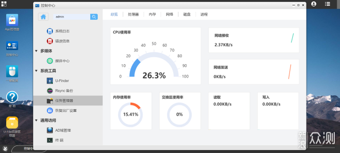 硬盘准备完毕,进入任务中心可以看到万由HS-401P的整体负载情况,如果出现卡顿等问题,可以到这个界面来排查一下,看看是不是CPU过载,或者内存不够用了。