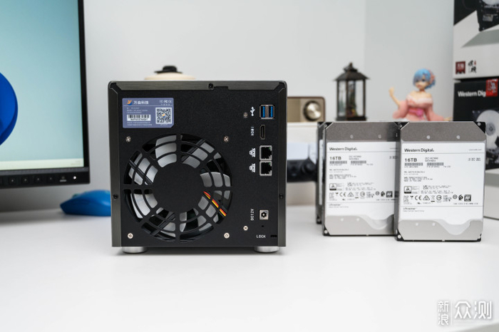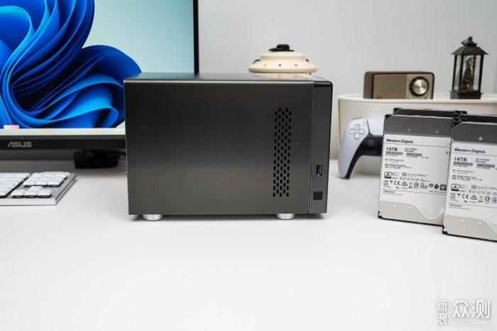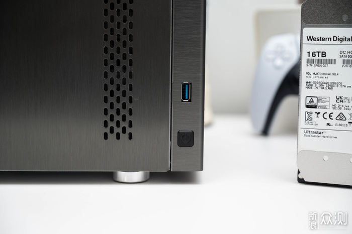 在尺寸方面,万由HS-401P的三维是272.5mmx190mmx180mm,比一个桌面音响大不了多少。至于西数HC550的外观设计就比较有辨识度,这块硬盘是基于传统磁记录技术(CMR),并不是现在常见的叠瓦式磁记录技术(SMR),在维护方面更简单,稳定性自然也无可挑剔。