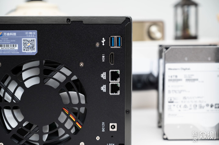 除了电源接口外,万由HS-401P还提供了两个USB3.0接口,一个全尺寸HDMI和两个RJ45网口,值得一说的是,这两个网口均为2.5GbE,传输速度有保证。