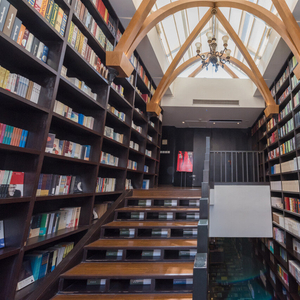 经过长时间的筹备,金浩于2013年4月23日正式开启了他的第一家钟书阁书店。它坐落在上海因富有英伦异国情调闻名的泰晤士小镇建筑群中。进入书店,满目间除了书还是书,不仅墙面上,连玻璃地面下也是藏书,颇为震撼。用书架围合出中心的图书“圣殿”,内部以镜面和白色为主,置身其中,仿佛坠入时空中的书海。