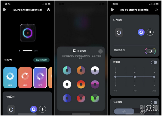 我不得不说的一点是,对于正面环绕于logo周边的灯效,夜间氛围感拉满,这还不够,为了更多形式的表现,我们还可以通过APP调节自己喜欢的颜色等等,甚至直接可以选择DJ音效,这才是JBL Party系列作为开派对时应该有的摸样!
