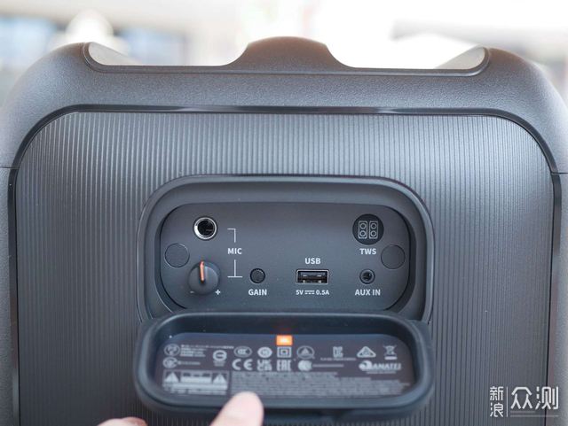 用料扎实应该是我的第一感受,毕竟除了276 x 327 x 293mm的三围尺寸摆在那里,更是拥有5.9kg的重量,这也就符合户外音响的特质了,你不用指望他有多么的便携,反而他更应该是沉稳厚重的。