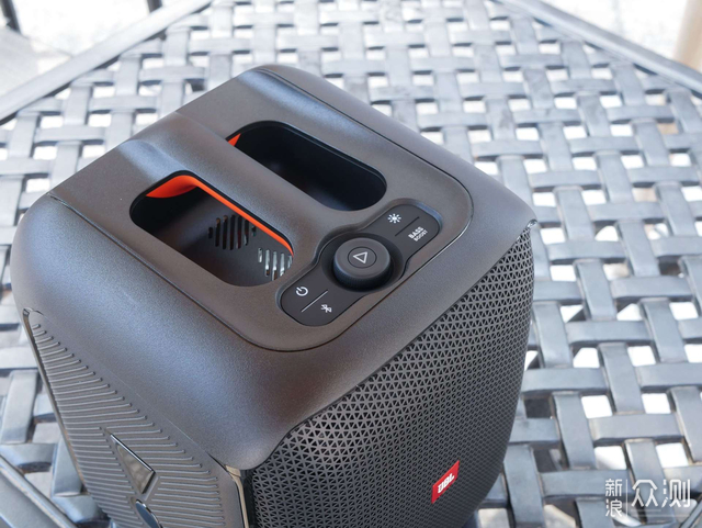 音响在户外使用必须要考虑的就是刮擦、防水等等,JBL PartyBox Encore Essential正面采用的是金属网工艺,除了所选材质自身的高强度之外,IPX4级别的防尘防水让其还具备一定的防泼水功能。镂空的下面可以直接看到灯光环绕的可发声单元,金属网周边与音响衔接很圆滑,我觉得中间的小LOGO点缀的很到位,橙色的配色让整个音响显得不那么沉闷!