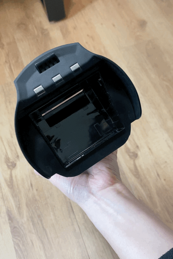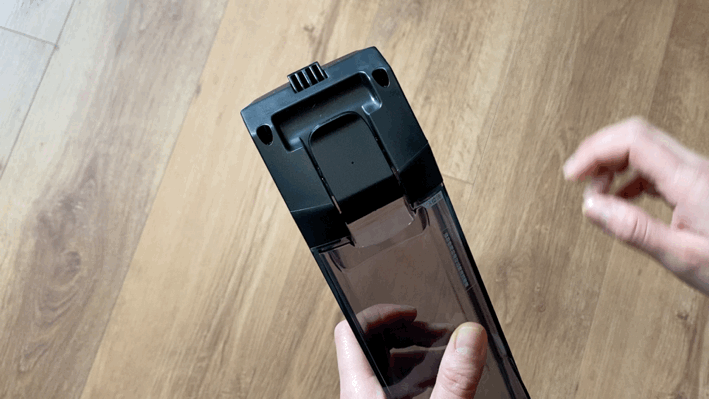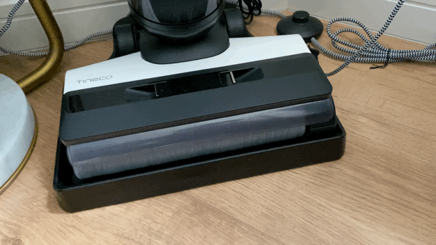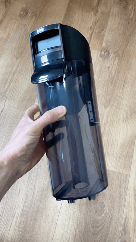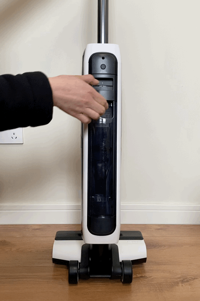 主机正面,在添可的英文logo下方是污水箱,采用按压式卡扣,拆装方便。