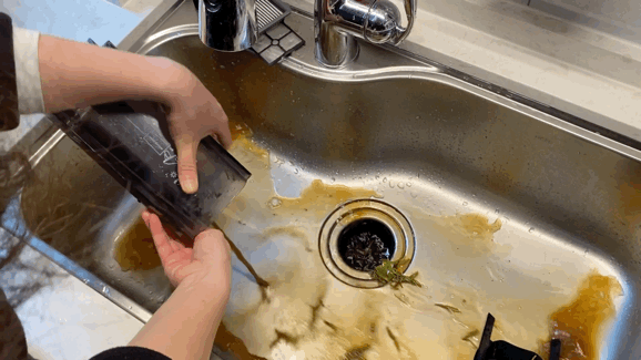 我家有垃圾处理器,清洗时只需把所有脏东西一起倒进下水道,再把污水桶冲洗干净就行了,非常方便。