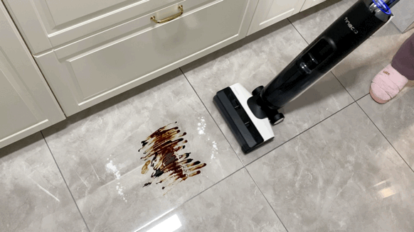 作为地面清洁利器,添可芙万2.0 LCD可以应对地砖、地板等任何材质,来看看实际清洁能力吧!厨房是最需要洗地机的地方,每次做完饭,地面油污在所难免,下图我模拟了一下极端的情况,左侧白色的是面粉、食盐、糖的混合粉末,深色的则是酱油、食用油的混合液,这都难不倒添可芙万2.0 LCD,拖两遍就干净了。