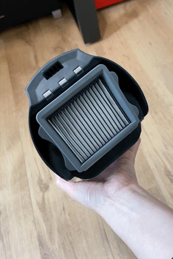 在污水箱顶部,带有HEPA滤网,可以避免灰尘进入主机及二次污染,比起某些品牌的洗地机在这个位置只放一块海绵要良心不少。