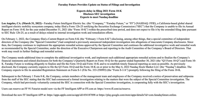 FF还在公告中称,在可以预见的未来,公司预计将继续产生重大经营亏损。