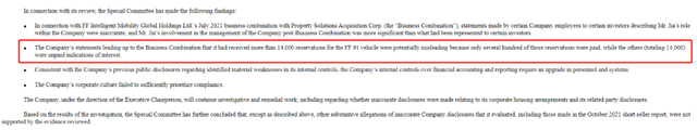 在FF独立特别调查委员会向美国证券监督委员会提交的报告中,他们表示“此前FF在上市招股书中所宣称的“已收到超过14000份FF 91车辆的预订”可能具有误导性,因为这些预订中只有数百个已付款,而其他(总计14000个)未付款。”