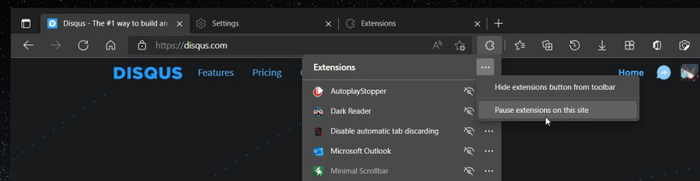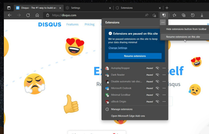微软正在 Edge Canary 中进行 A / B 测试,也就是说一部分用户可以体验到。当用户暂停扩展时,网站会进行重新加载。扩展程序暂停后,网站上将出现一条横幅,说明“我们已暂停此站点上的扩展程序以尽量减少您的数据共享”。