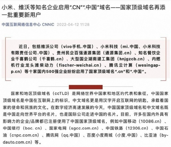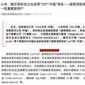 4月12日中午,中国互联网络信息中兴CNNIC正式宣布,包括小米科技、维沃公司、知名餐饮企业千喜鹤公司、腾讯云计算等事假国内500强企业纷纷启用了国家顶级域名“.cn”和“.中国”,中文域名既是中国走向世界平台的名片,也是国际公司走进中国的名片。