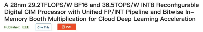 1.Tu, F., et al. A 28nm 29.2TFLOPS/W BF16 and 36.5TOPS/W INT8 Reconfigurable Digital CIM Processor with Unified FP/INT Pipeline and Bitwise In-Memory Booth Multiplication for Cloud Deep Learning Acceleration. in 2022 IEEE International Solid- State Circuits Conference (ISSCC). 2022. IEEE.