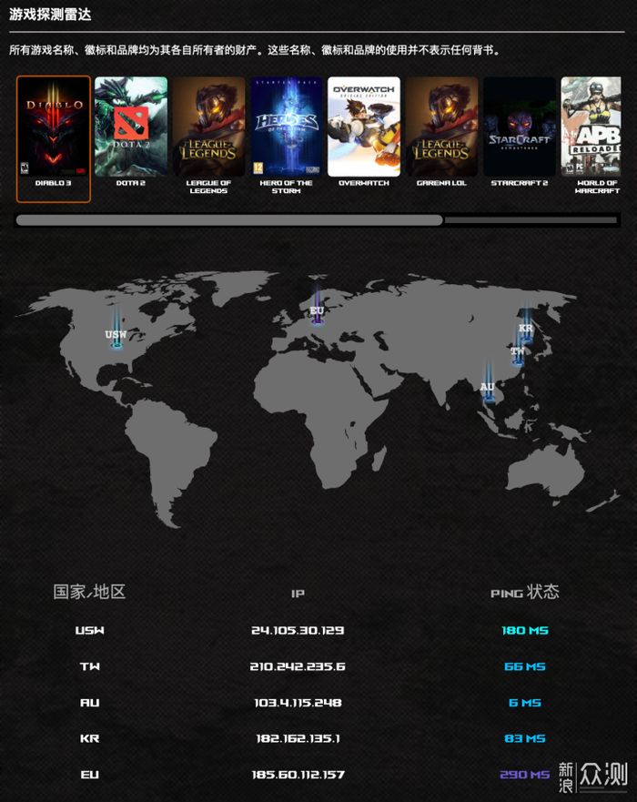 游戏探测雷达实时显示超过10款热门电竞游戏在全球各地服务器连接速度,便于玩家选择最快的服务器与世界同胞展开激烈的对抗。