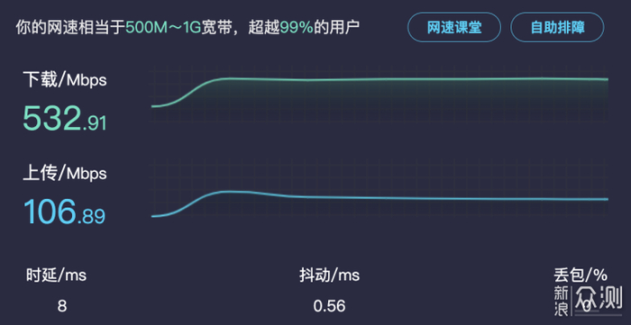 用MacBook Pro M1在5GHz频段下测试,测试点在距路由器约半米距离,ROG GT-AX6000下载532Mbps、上传106Mbps,AX86U下载475Mbps、上传105Mbps,速度几乎相同。
