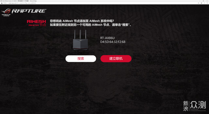 ROG GT-AX6000支持Mesh技术扩展WiFi网络覆盖,当然兼容性最好的方式莫过于自家产品之间的AiMesh,和同为博通CPU方案的AX86U更是堪称天生一对。设置的方式很简单,网线连接2个路由器的LAN,AiMesh页面点击“添加AiMesh节点”按钮。
