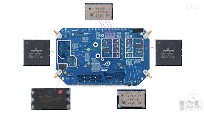 ROG官网公布出的参数较为概括,没有体现出具体芯片的型号。既然无法自己拆解,就借鉴其他大神的评测,找到了Koolshare在B站做过的非常详实的视频拆解。