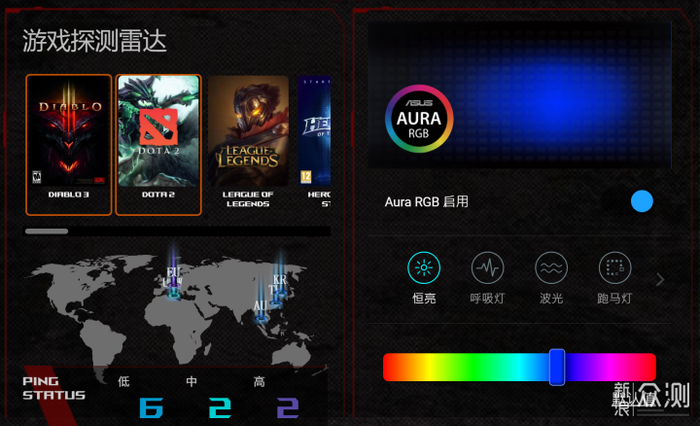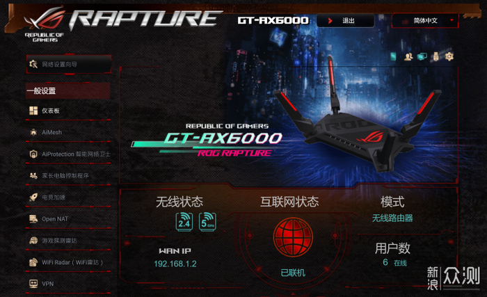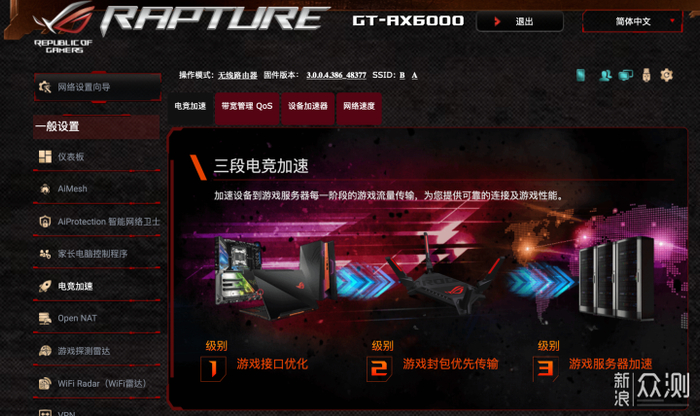华硕系路由器固件的强大功能一直以来就受到网络高手追捧,以至于冒着变砖的风险去将其他品牌产品破解刷上华硕固件。ROG则在巨人的肩膀上再度进化,加入面向电竞玩家的针对性功能,如:电竞加速、游戏探测雷达、RGB灯效等,UI设计浓浓的电竞气息铺面而来,仿佛是个热门游戏的官网。
