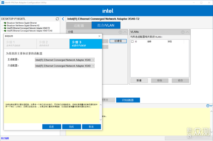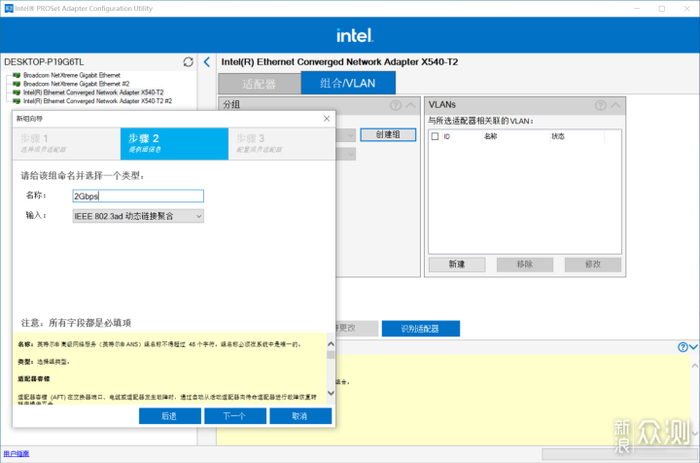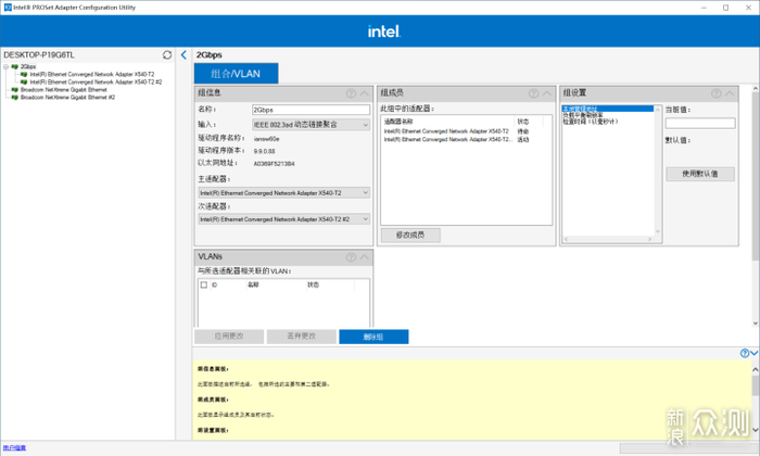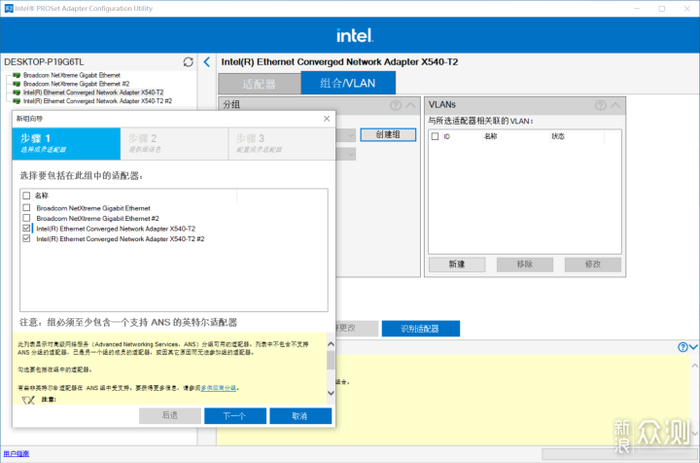 电脑端安装Intel PROSet网卡管理软件,在组合/VLAN选项卡点击“创建组”,然后勾选2个Intel X540-T2网卡。