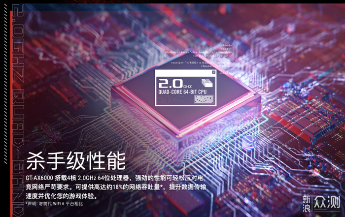 不得不说,ROG GT-AX6000的艺术照欺骗性很高,初见商祥页竟以为是小型化产品,看过用户的晒单才对其巨大的身姿有所了解。不过为了桌面空间不被过多占据,贴心地在机身背部设计了挂墙开槽,支持挂墙安装。包装盒正面突出5大卖点:4核2.0GHz博通CPU、双2.5Gbps电竞网口、3重电竞加速、AiMesh、AiProtection(防 火墙)。