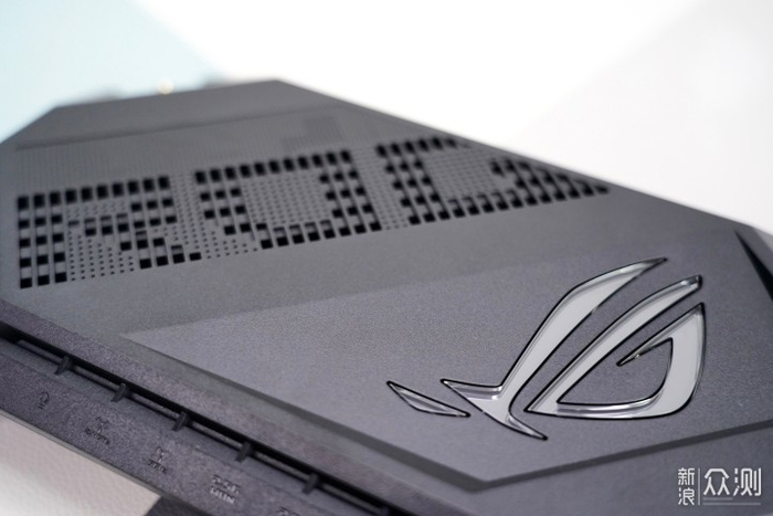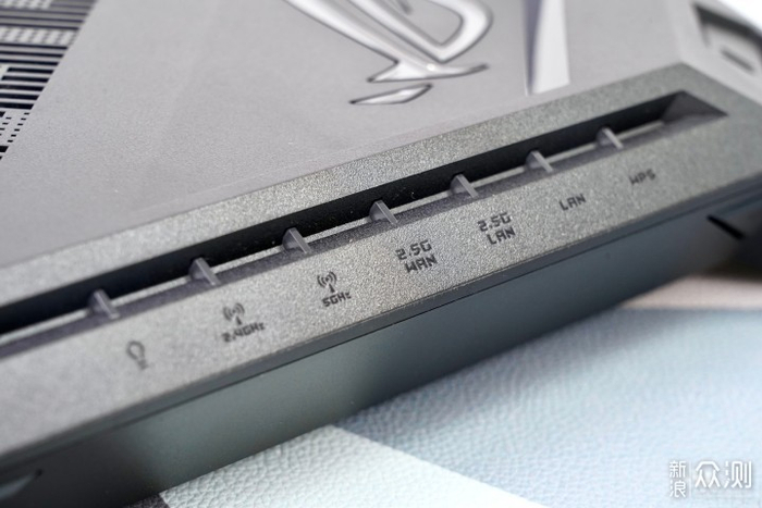 前方凹槽内嵌电源、2.5/5GHz WiFi、2.5Gbps WAN/LAN、LAN、WPS状态指示灯。两侧各加入1个三角形按钮,左侧WPS快速验证、右侧RGB灯光切换。