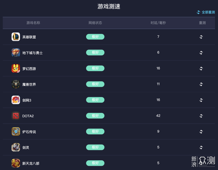 主流网络游戏延迟测试,除《剑网3》、《DOTA2》外均不超过20ms,是玩家极为理想的网络对战环境。