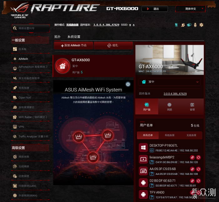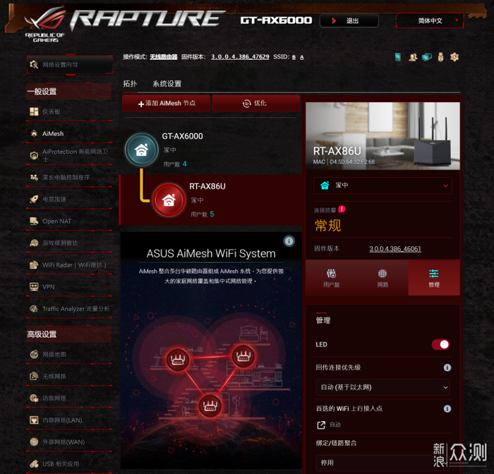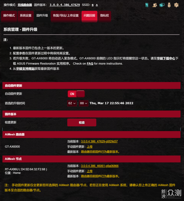 此时AiMesh页面出现AX86U的身影,令本人大感意外的是,右侧竟然可以直接调节AX86U的选项,升级固件也是统一管理,极大简化多个路由器环境下设置步骤。但!连接质量区域显示为“常规”,且亮起了红色感叹号。
