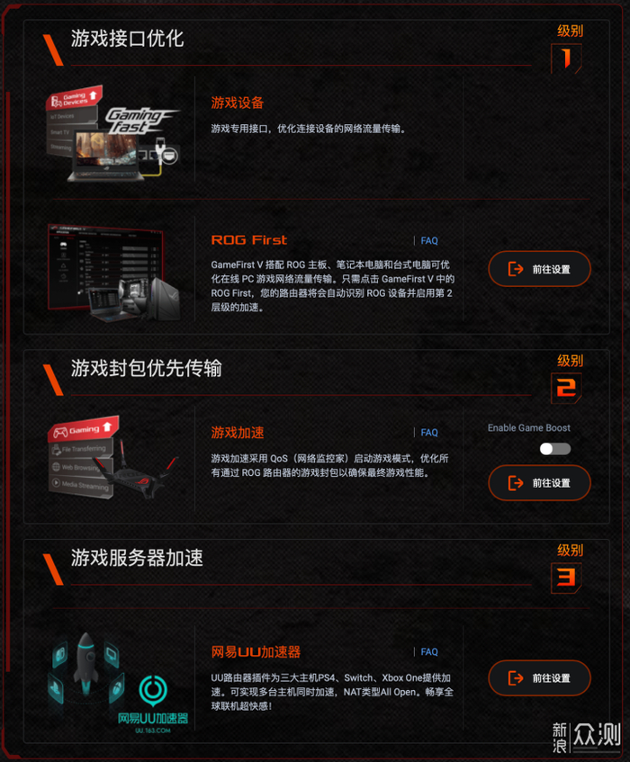 电竞加速从:接口优化,路由器的2.5Gbps电竞网口连接ROG主板、笔记本、台式机;封包优先传输,开启QoS游戏模式;服务器加速,网易UU加速器。3个硬件+软件层面,共同降低游戏网络延迟。