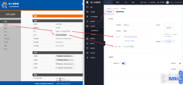 首先你自然是需要去有人云的网站(cloud.usr.cn)注册一个账号,完成注册之后添加设备,需要添加SN码与IMEI码,这两个信息在路由器后台都可以查询到。