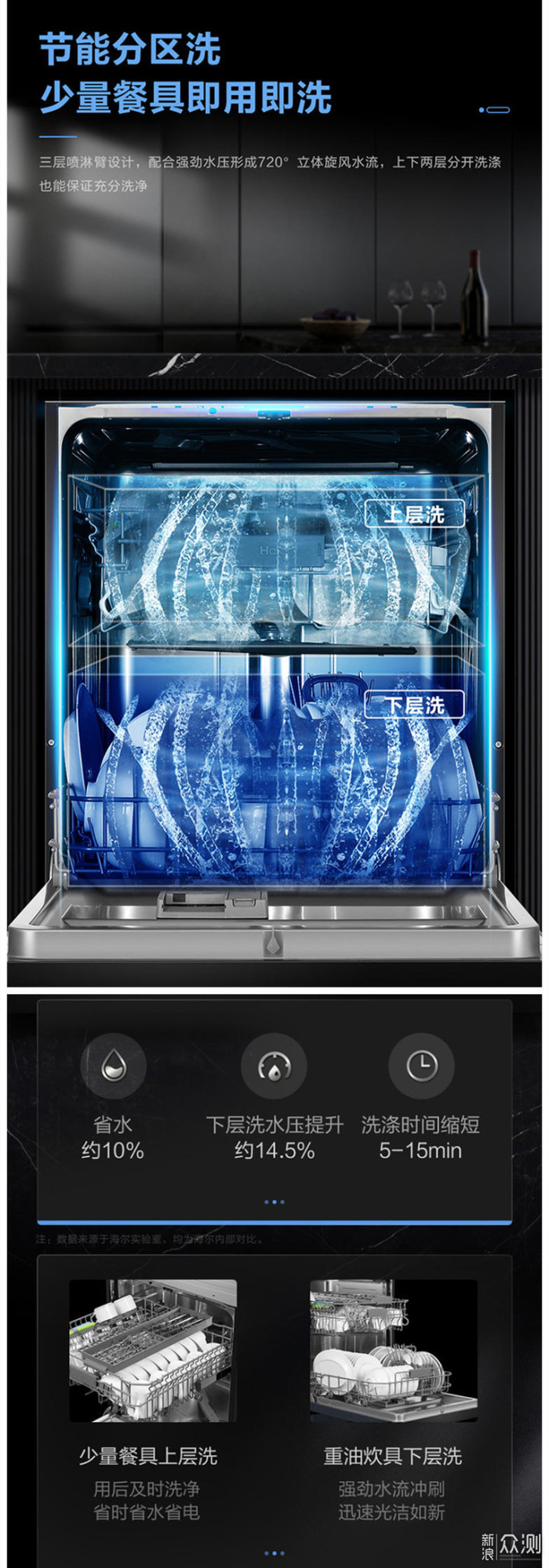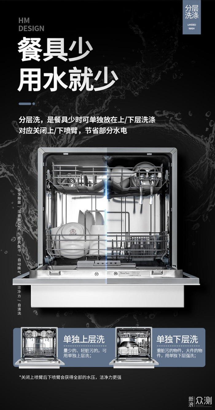 小结:“分层洗”是独立让某一层清洗,跟过往洗碗机“轻载”模式有本质的区别,是实现大容量洗碗机洗少量餐具的关键。