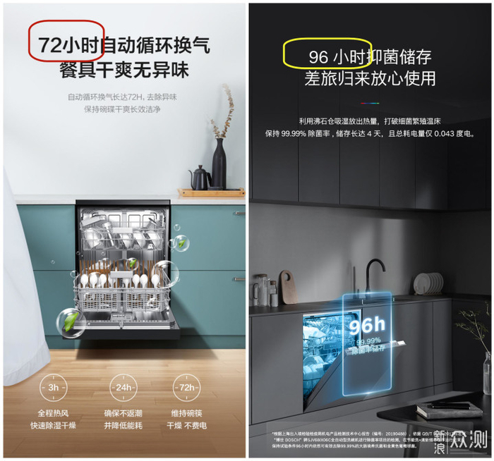 因为更好的烘干方式,配合杀菌消毒功能,现在很多洗碗机提出了长时间存放餐具的卖点。毕竟节省了橱柜空间,省了碗架柜,对于寸土寸金的厨房空间是好事。而各品牌之间的差异,主要在存储时长上。72小时是入门,96小时稍好,现在已经有了168小时(7天)储存的了。