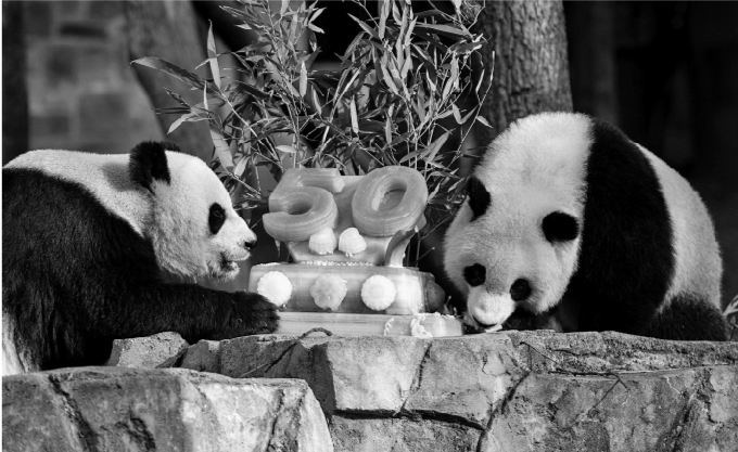 4月16日,史密森学会国家动物园专门制作的纪念日蛋糕用料全是大熊猫的最爱——由稀释苹果汁和菠萝汁冰冻成胚子,再用红薯、胡萝卜、梨、甘蔗、香蕉和竹子装饰。游客们饶有兴致地现场观赏这场“母子吃播秀”,欢声笑语不断。很多人拿出手机拍照、录视频,甚至随即转发在社交媒体上。
