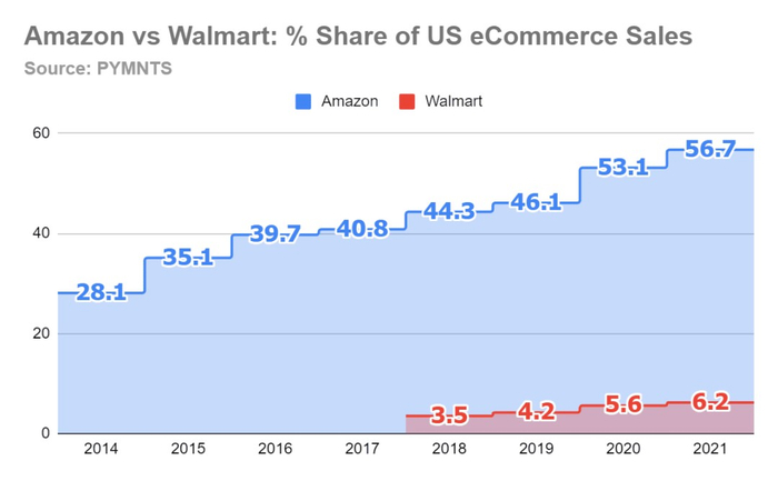 数据显示,亚马逊2021年在美国电商市场的销售份额创下56.7%的历史新高,直接导致亚马逊在美国零售总和中的市场份额增长到9.4%,而沃尔玛的份额为8.6%。这意味着创立28年的亚马逊首次超越创立60年的沃尔玛,成为美国本土的零售之王。