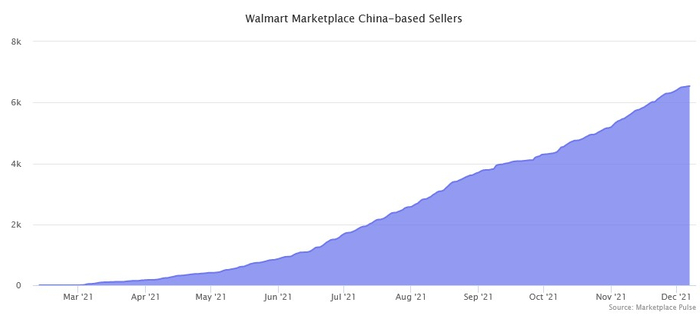数据显示,2021年3月以来,中国卖家陆续进入沃尔玛市场,到2021年12月,在沃尔玛销售产品的中国大卖增长了超过6000家。
