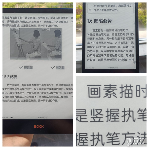 看漫画和视频因为墨水屏刷新率的限制,体验上会打折扣,不过因为只能显示黑白色,反而有一种老电视机的怀旧感觉。文石设置了普通、快速、极速、x刷新四种刷新模式,通过同一张图片的对比可以明显看到显示效果的差异。
