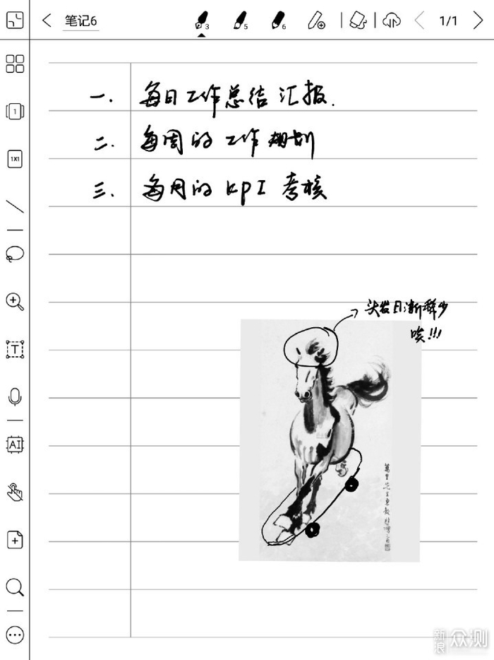 做会议纪要可以使用笔记功能,前边已经提到,在笔记页面还可以插入图片、语音等要素,还可以AI识别转换,把手写文字一键转换成文本,进行调整后分享、打印。