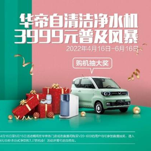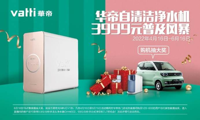2022年4月16日-6月16日,华帝净水重磅推出“华帝自清洁净水机3999普及风暴”。活动期间,凡成功全款购买V20且通过“华帝健康家”填报完整信息的用户或6月16日当天在直播间购买V20的用户,均有机会赢取五菱宏光MINIEV汽车大奖。(注:不参与直播抽奖互动视为放弃抽奖机会,无购机凭证中奖无效)