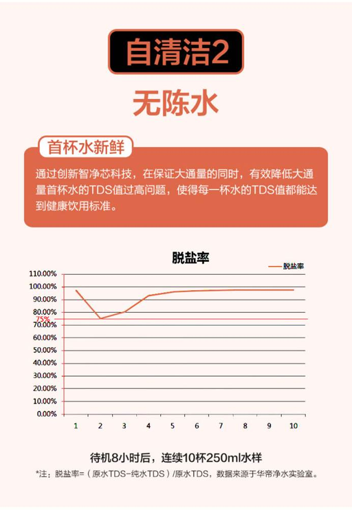 当净水机长时间停止工作后,机器内残留的原水和纯水因浓度差而发生渗透作用,使得机器内部纯水被二次污染,导致早晨第一杯水的TDS值会很高无法直饮。通过创新智净芯科技,在保证大通量的同时,有效降低大通量首杯水的TDS值过高问题,使得每一杯水的TDS值都能达到健康饮用标准。