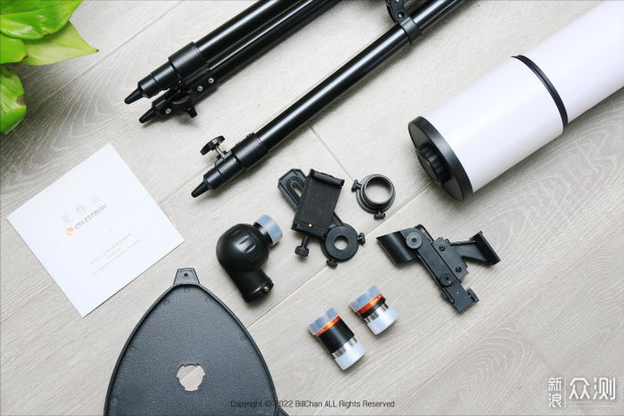 褪去所有包装和布袋,我们能够看到星特朗SCTW-80天文望远镜的配件还是比较丰富的:物镜主体、天顶镜、三脚架、23mm非球面目镜、10mm目镜、红点寻星镜、托架、手机支架以及说明书,配件还是非常丰富的说。