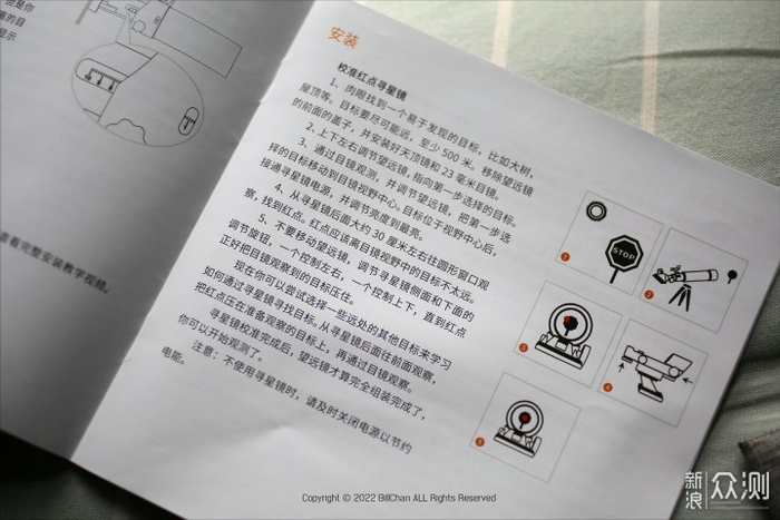 通过说明书的指引,先找到一个视觉目标,然后对激光红点进行调节,完成这一步之后,以后只要打开寻星镜,在里面找到红点对应的位置,就是我们观察的目标点,这个设计真是简单又实用。