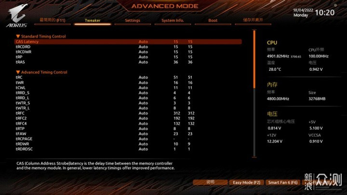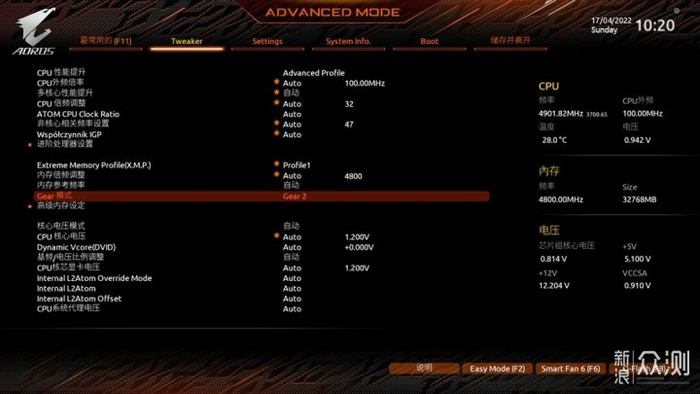 在技嘉主板的BIOS中,我们按F2可以进入高级菜单。在Tweaker界面,Extreme Memory Profile(X.M.P)选项中,默认是关闭的,选择Profile 1就是打开内存超频功能,在开启XMP 3.0技术后,金百达DDR5内存条的频率在4800MHz。对于超频新手来说,开启XMP3.0后亦能轻松拥有好性能。而对于超频老手来说,接下来我们也势必要榨干这2根内存的极限,看看它到底有多能超,嘻嘻。