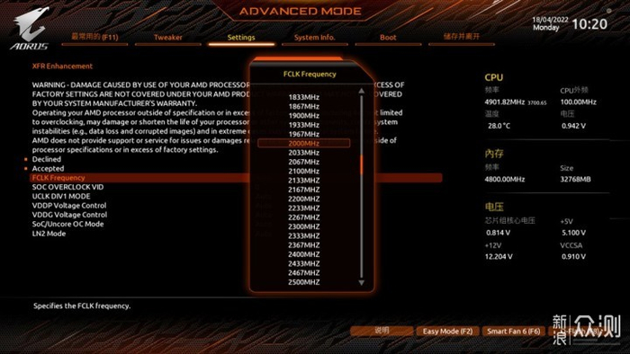 值得注意的是,当内存超频至4800MHz或者更高的时候,有可能会有内存分频的情况出现。这里我们需设置FCLK,当然设置此目的是为了FCLK的频率和内存的频率保持一致,这样才能保证内存性能正常发挥。技嘉主板的BIOS设置FCLK步骤如下:Settings-AMD CBS-NBIO CommonOptions-XFR –Enchancement-FCLK Frequency。一般情况FCLK参数是内存频率的一半,比如4800Mhz频率,FCLK则需要设置为2400,以此类推。