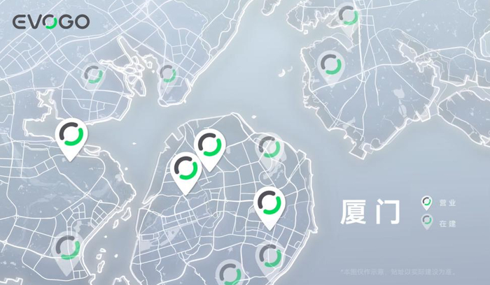 快换站铺设密度方面,根据官方信息,首批在厦门启动服务的EVOGO快换站共有4座,分别位于厦门思明区、湖里区和海沧区,预计到今年底,将在厦门完成30座快换站的投建。届时,厦门岛上每3公里的服务半径内将有1座快换站。