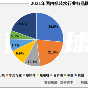 据观研天下数据显示,国内瓶装水行业集中度较高。截至2021年,位居行业第一的农夫山泉市占率达到26.5%,华润怡宝市占率为21.3%,位列第二;康师傅、娃哈哈、百岁山、冰露市占率分别为10.1%、9.9%、7.4%、5.3%。