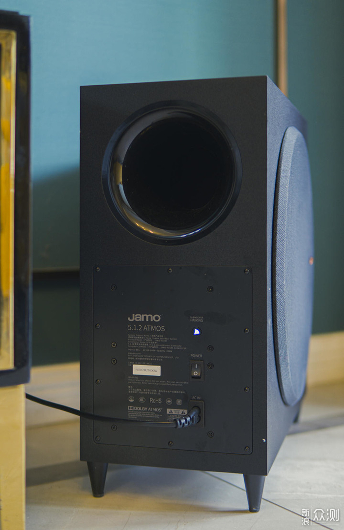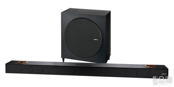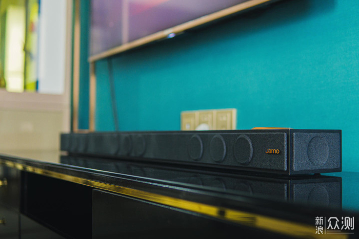 回音壁右侧有金色“Jamo”标识,侧面的环绕音响单元处向内凹陷,内置2英寸全频单元。