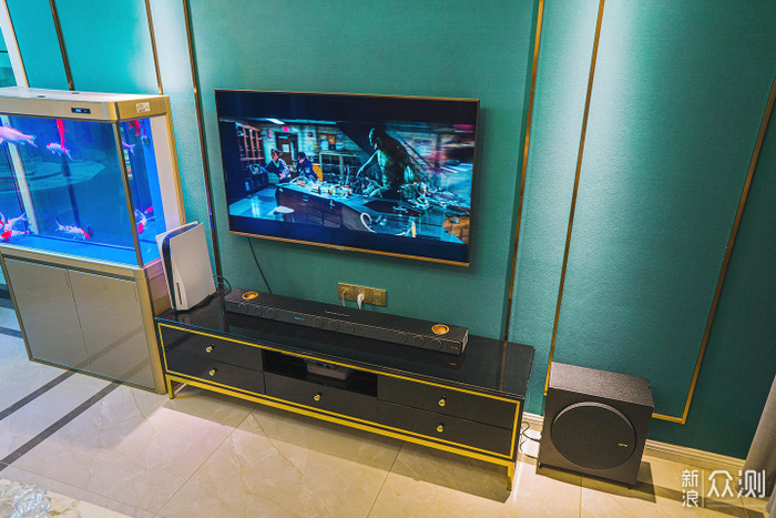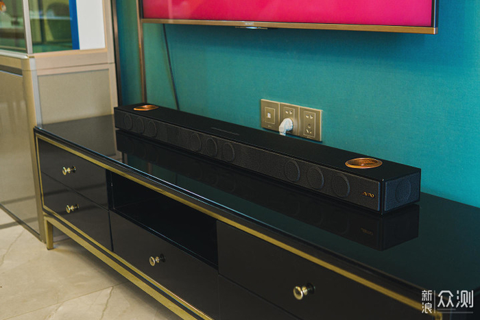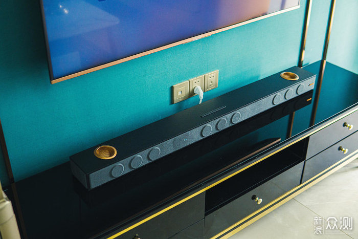 侧面倒相孔+超薄机身+无线连接,让低音炮的摆放有了更多可能,这里我就把它放在电视柜的一侧,留出少许空隙,其电源线刚好绕过电视柜下方。