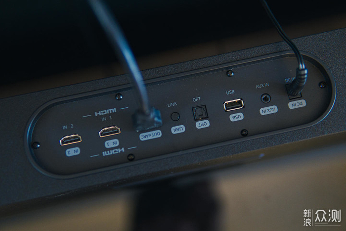 接口方面,Jamo HCSB5后侧有AUX IN、OPT光纤口、HDMI IN*2、HDMI OUT可供用户选择,AUX IN只支持双声道立体声,不建议使用,光纤口和HDMI则支持5.1声道,我这里电视连接的是HDMI口。