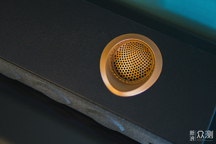顶部向上发声单元使用的是2.5英寸全频单元,金色网罩格外亮眼,表面的弧度处理可以让声音具有一定的方向性,减少传播损耗。