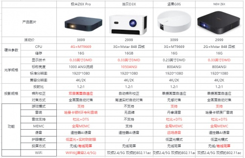 最近随着Z6X Pro发布,上个周末我把四台投影凑到一起,针对画质、音质、易用性这三大重点,做了一次对比评测。大家可以看下参数配置,熟悉一下优劣势和升级点。