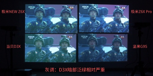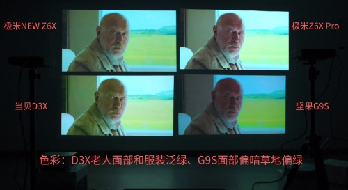 NEW Z6X亮度与D3X相当,但在色彩还原上更加精准。D3X在亮场表现较好,但遇到暗场就会产生比较严重的泛绿。至于G9S,则在各个方面都不尽如人意。