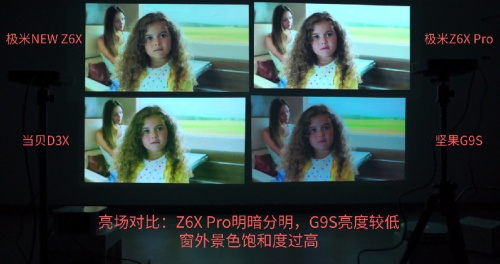 最后,我们再来上面这张能体现四台投影画质特点的照片,做个小结。Z6X Pro虽然标称亮度只有1000ANSI流明,但实际亮度明显更高,明暗细节对比更加明显,同时没有偏色,整体感受也十分通透。
